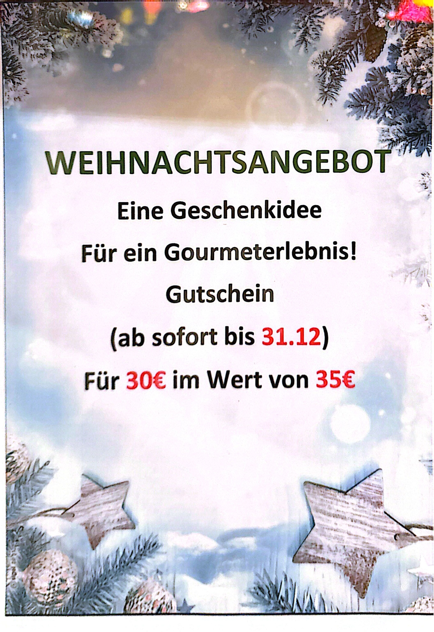Wir haben am 23.12. und am 24.12.2025 geschlossen. Ab dem 25.12.2025 haben wir wieder normal für Sie geöffnet.